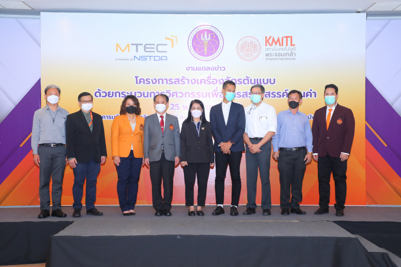 วันที่ 25 พฤษภาคม 2565 - รศ.ดร.อนุวัฒน์ จางวนิชเลิศ รักษาการแทนอธิการบดีสถาบันเทคโนโลยีพระจอมเกล้าเจ้าคุณทหารลาดกระบัง (สจล.), นายธนาภรณ์ โกราษฎร์ หัวหน้าโครงการบริหารจัดการสร้างเครื่องจักรต้นแบบด้วยกระบวนการวิศวกรรมเพื่อการสร้างสรรค์คุณค่า วิศวกรอาวุโส สำนักงานวิทยาศาสตร์และเทคโนโลยีแห่งชาติ (MTEC สวทช.) และ นางวนิดา บุญนาคค้า ผู้อำนวยการกองส่งเสริมและประสานเพื่อประโยชน์ทางวิทยาศาสตร์ วิจัยและนวัตกรรม สำนักงานปลัดกระทรวงการอุดมศึกษา วิทยาศาสตร์ วิจัยและนวัตกรรม (กปว.สป.อว.) ร่วมกันแถลงข่าว “โครงการสร้างเครื่องจักรต้นแบบด้วยกระบวนการวิศวกรรมเพื่อการสร้างสรรค์คุณค่า 6 โครงการ”