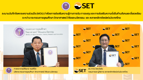 ศ.ดร.นพ.สิริฤกษ์ ทรงศิวิไล ปลัดกระทรวงการอุดมศึกษา วิทยาศาสตร์ วิจัยและนวัตกรรม (อว.) และนายภากร ปีตธวัชชัย กรรมการและผู้จัดการ ตลาดหลักทรัพย์แห่งประเทศไทย ร่วมลงนามลงนามความร่วมมือ (MOU) ส่งเสริมความรู้ทางการเงินและการลงทุนให้แก่นิสิตนักศึกษา อาจารย์ บุคลากรสถาบันอุดมศึกษา และบุคลากรสังกัดกระทรวง อว. ผ่านเครื่องมือและสื่อการเรียนรู้ของตลาดหลักทรัพย์ฯ ทั้งในรูปแบบออนไลน์และออฟไลน์ เพื่อสร้างความมั่นคงทางการเงินในระยะยาว คาดว่าจะเข้าถึงกลุ่มเป้าหมายรวมกว่า 1.5 ล้านคนทั่วประเทศ