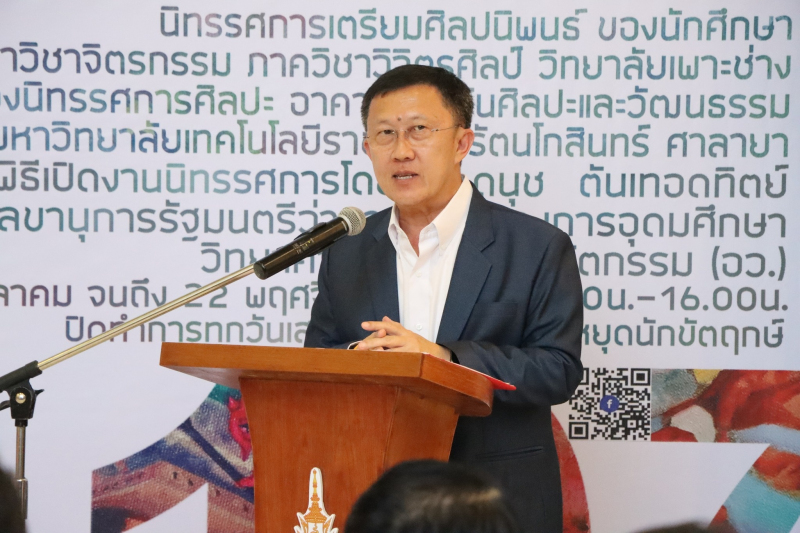 ดร.ดนุช ตันเทอดทิตย์ เลขานุการรัฐมนตรีว่าการกระทรวงการอุดมศึกษา วิทยาศาสตร์ วิจัยและนวัตกรรม (อว.) เป็นประธานในพิธีเปิดนิทรรศการเตรียมศิลปะนิพนธ์ของนักศึกษา มหาวิทยาลัยเทคโนโลยีราชมงคลรัตนโกสินทร์ วิทยาลัยเพาะช่าง โดยภาควิชาวิจิตรศิลป์ สาขาวิชาจิตรกรรม พร้อมให้ความสนใจเข้าเยี่ยมชมผลงานของน้องๆ นักศึกษาที่ร่วมจัดแสดงผลงาน รวมถึงร่วมพูดคุยให้กำลังใจและสอบถามแนวคิดที่มาของการสร้างสรรค์ผลงาน เมื่อวันที่ 26 ตุลาคม 2565 ที่ผ่านมา ณ ห้องนิทรรศการ ชั้น 2 อาคารปฏิบัติการศิลปวัฒนธรรมอาเซียนเฉลิมพระเกียรติ มทร.รัตนโกสินทร์ จ.นครปฐม