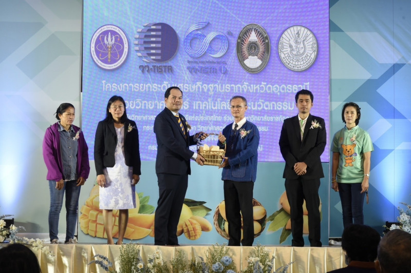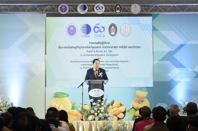 14 ธันวาคม 2565 ดร.ลัทธจิตร มีรักษ์ ผู้ช่วยรัฐมนตรีประจำกระทรวง อว. เป็นประธานเปิดโครงการยกระดับเศรษฐกิจฐานรากระดับจังหวัดด้วยวิทยาศาสตร์ เทคโนโลยี และนวัตกรรม จังหวัดอุดรธานี ณ มหาวิทยาลัยราชภัฏอุดรธานี โดยมี ดร.วิบูล เป็นสุข รองอธิการบดีมหาวิทยาลัยราชภัฏอุดรธานี กล่าวต้อนรับ และ ดร.รจนา ตั้งกุลบริบูรณ์ ผู้อำนวยการศูนย์เชี่ยวชาญนวัตกรรมกรรมเกษตรสร้างสรรค์ สถาบันวิจัยวิทยาศาสตร์และเทคโนโลยีแห่งประเทศไทย (วว.) กล่าวรายงานวัตถุประสงค์การจัดงาน โดยผู้เข้าร่วมโครงการได้แก่ตัวแทนเกษตรกรผู้ผลิตมะม่วงนํ้าดอกไม้สีทองในจังหวัดอุดรธานี