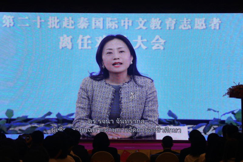 ด้าน นางเฝิง จวินอิง ได้กล่าวแทน นายหาน จื้อเฉิน เอกอัครราชทูตสาธารณรัฐประชาชนจีน ประจำประเทศไทย ที่ติดภารกิจไม่สามารถเข้าร่วมงานได้ ว่า ขอแสดงความยินดีกับครูอาสาสมัครสอนภาษาจีน รุ่นทีั 20 จำนวน 876 ท่าน ที่ได้ดำเนินการสอนภาษาจีนในประเทศไทยได้อย่างสมบูรณ์ โครงการครูอาสาสมัครสอนภาษาจีนในประเทศไทย เริ่มต้นตั้งแต่ปี 2003 ทั้งหมด 20 รุ่น มีครูอาสาสมัครชาวจีนที่ร่วมโครงการทั้งหมด จำนวน 19,470 ราย ส่งผลให้มีผู้เรียนภาษาจีนในประเทศไทยเพิ่มขึ้นอย่างรวดเร็ว ปฏิเสธไม่ได้ว่าความสำเร็จด้านการพัฒนาการเรียนการสอนภาษาจีนของประเทศไทย ส่วนหนึ่งมาจากคุณูปการอันสำคัญของครูอาสาสมัครชาวจีนที่มีความมุ่งมั่นในการถ่ายทอดภาษาและวัฒนธรรมจีน เชื่อมความสัมพันธ์ของไทยและจีนตามคำที่กล่าวว่า "จีนไทยใช่อื่นไกล พี่น้องกัน" และด้วยความร่วมมือกันระหว่างรัฐบาลไทยและจีนจะทำให้ภาษาจีนในประเทศไทยได้รับการพัฒนาอย่างต่อเนื่องและสร้างความสำเร็จใหม่ สร้างรากฐานที่มั่นคงเพื่อแลกเปลี่ยนวัฒนธรรมและเกิดความเข้าใจระหว่าง 2 วัฒนธรรมต่อไป