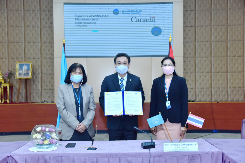 (วันที่ 27 มกราคม 2564) นายเพิ่มสุข สัจจาภิวัฒน์ เลขาธิการสำนักงานปรมาณูเพื่อสันติ และ Mr. Lars van Dassen ผู้อำนวยการบริหารสถาบันเพื่อความมั่นคงปลอดภัยทางนิวเคลียร์โลก ลงนามบันทึกความเข้าใจระหว่างสถาบันเพื่อความมั่นคงปลอดภัยทางนิวเคลียร์โลก กับสำนักงานปรมาณูเพื่อสันติ ในรูปแบบออนไลน์ เพื่อจัดทำข้อตกลงร่วมกัน โดย WINS จะสนับสนุนประเทศไทยในรูปแบบของการถ่ายทอดองค์ความรู้ด้านความมั่นคงปลอดภัยทางนิวเคลียร์และส่งเสริมการจัดตั้งศูนย์สนับสนุนความมั่นคงปลอดภัยทางนิวเคลียร์ (Nuclear Security Support Center: NSSC) ในอนาคต โดยมี ปส. เป็นศูนย์กลาง ซึ่งความร่วมมือดังกล่าวจะเป็นการสร้างประโยชน์ในการพัฒนายุทธศาสตร์ฝึกอบรมด้านความมั่นคงปลอดภัยทางนิวเคลียร์ของประเทศ รวมทั้งพัฒนาความเชี่ยวชาญทางวิชาชีพด้านความมั่นคงปลอดภัยทางนิวเคลียร์ของหน่วยงานที่เกี่ยวข้องของไทย อาทิ จุฬาลงกรณ์มหาวิทยาลัย และสถาบันเทคโนโลยีนิวเคลียร์แห่งชาติ (องค์การมหาชน) อีกทั้งยังเป็นการเตรียมความพร้อมสำหรับการออกใบรับรองภายนอกของการเรียนรู้ภายใต้มาตรฐาน ISO 29993