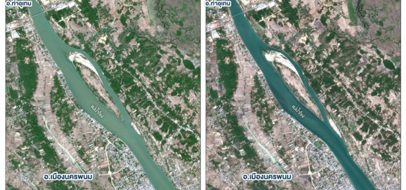 GISTDA เผยภาพแม่น้ำโขงที่เกิดการเปลี่ยนแปลงจนเห็นพื้นผิวของน้ำเป็นสีครามจากดาวเทียม Sentinel-2 เปรียบเทียบกัน 2 ช่วงเวลา คือเมื่อวันที่ 3 มกราคม 2564 และวันที่ 7 กุมภาพันธ์ 2564 พบว่าสีน้ำในลำน้ำโขงมีความแตกต่างกันอย่างชัดเจน โดยการเกิดน้ำโขงสีครามเป็นตัวบ่งชี้ถึงวิกฤติน้ำโขงที่ระดับพื้นผิวน้ำลดลงอย่างมากในช่วง 1 เดือนที่ผ่านมา ทำให้สามารถสังเกตเห็นตะกอนในลำน้ำได้ชัดขึ้น และจะเห็นได้ว่าริมตลิ่งของพื้นที่ทั้งสองฝั่งแนวลำน้ำสามารถมองเห็นสันดอนทรายหรือเกาะกลางแม่น้ำในลำน้ำโขงได้อย่างชัดเจน จากสถานการณ์นี้อาจส่งผลกระทบต่อระบบนิเวศ รวมถึงผลผลิตทางการเกษตรไม่ว่าจะเป็น ข้าว, ยางพารา, ยาสูบ, มะเขือเทศ ในเขตภาคตะวันออกเฉียงเหนือโดยเฉพาะจังหวัดที่อยู่ติดกับแม่น้ำโขง อาทิ นครพนม มุกดาหาร อำนาจเจริญ และอุบลราชธานี