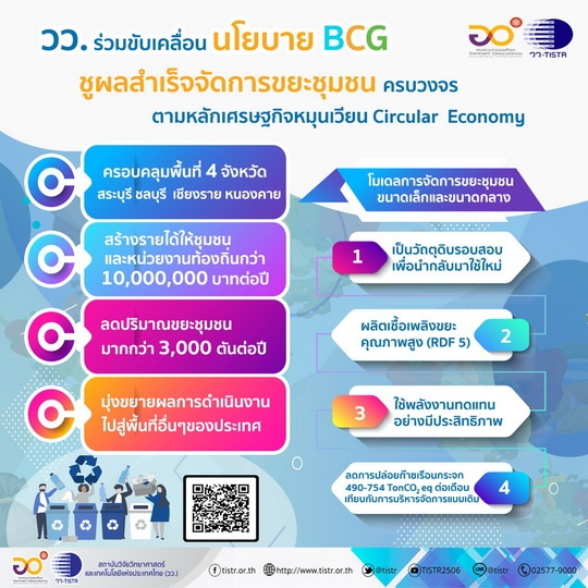 วว. ร่วมขับเคลื่อนนโยบาย BCG ชูผลสำเร็จจัดการขยะชุมชนครบวงจรในพื้นที่ 4 ภูมิภาคของไทย ตามหลักเศรษฐกิจหมุนเวียน สามารถสร้างรายได้ให้หน่วยงานท้องถิ่นกว่า 10,000,000 บาทต่อปี
