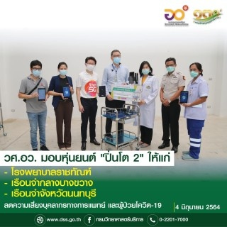 วันที่ 4 มิถุนายน 2564 กรมวิทยาศาสตร์บริการ (วศ.) กระทรวงการอุดมศึกษา วิทยาศาสตร์ วิจัยและนวัตกรรม (อว.) โดย ดร.ปาษาณ กุลวานิช นักวิทยาศาสตร์ชำนาญการ กองวัสดุวิศวกรรม หัวหน้าโครงการ "การพัฒนาระบบจัดการให้บริการสาธารณสุขด้วยหุ่นยนต์เคลื่อนที่บังคับระยะไกลภายใต้สถานการณ์โรคติดต่อร้ายแรง" พร้อมตัวแทนภาคเอกชนที่ร่วมโครงการซึ่งมีนายวิฑูรย์ เจียมศิริกาญจ์ รองผู้อำนวยการและคณะทำงาน 5 G บมจ. ทรู คอร์ปอเรชั่น ผู้แทนบริษัท เจ็นซิฟ จำกัด และบริษัท โอโบดรอยด์ คอร์ปอเรชั่น จำกัด เป็นผู้แทนส่งมอบหุ่นยนต์ขนาดเล็กบังคับมือ “ปิ่นโต 2” จำนวน 3 ตัว ให้กับ พญ. รพีพรรณ รัตนวงศ์นรา มอร์ด คณะแพทยศาสตร์โรงพยาบาลรามาธิบดีมหาวิทยาลัยมหิดล สำหรับใช้งานในโรงพยาบาลราชทัณฑ์ เรือนจำกลางบางขวาง และ เรือนจำจังหวัดนนทบุรี เพื่อใช้งาน สำหรับแพทย์ พยาบาล และเจ้าหน้าที่ในการดูแลผู้ป่วยโควิด-19 ซึ่งเป็นผู้ต้องขังจากเรือนจำ