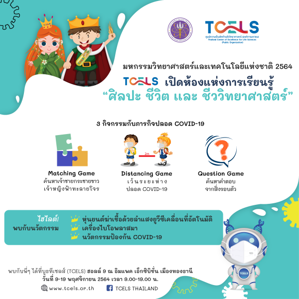 กระทรวงการอุดมศึกษา วิทยาศาสตร์ วิจัยและนวัตกรรม โดยศูนย์ความเป็นเลิศด้านชีววิทยาศาตร์ (องค์การมหาชน) หรือ ทีเซลส์ (TCELS) เปิดห้องแห่งการเรียนรู้ “ศิลปะ ชีวิต เเละ ชีววิทยาศาสตร์” (Art & Life Sciences by TCELS) เสริมสร้างความรู้ด้านศิลปะ ชีววิทยาศาสตร์ให้น้องๆ เยาวชนได้เรียนรู้แบบง่ายๆ สนุกสนานกับกิจกรรมเกมชีวิตวิถีใหม่ ห่างไกล COVID-19 กับ 3 กิจกรรมภารกิจปลอด COVID-19 กิจกรรมฐานที่ 1 Matching Game : ค้นหาเจ้าชายกระชายขาว เจ้าหญิงฟ้าทะลายโจร ฐานที่ 2 Distancing Game : เว้นระยะห่าง ปลอด COVID-19 (ห่างกันสักพัก...แต่รักกันเหมือนเดิม) และฐานที่ 3 Question Game : ค้นหาคำตอบจากสิ่งรอบตัว