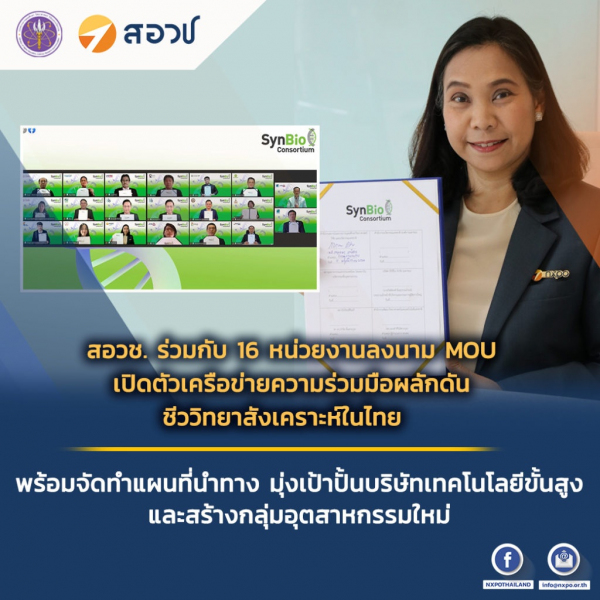 (11 พฤศจิกายน 2564) สำนักงานสภานโนยบายการอุดมศึกษาวิทยาศาสตร์ วิจัย และนวัตกรรมแห่งชาติ (สอวช.) ร่วมแสดงเจตจำนงในการลงนามบันทึกข้อตกลงความร่วมมือ (MOU) โครงการ Thailand Synthetic Biology Consortium ร่วมกับ 16 หน่วยงาน ได้แก่ สำนักงานพัฒนาวิทยาศาสตร์และเทคโนโลยีแห่งชาติ (สวทช.) โดยศูนย์พันธุวิศวกรรมและเทคโนโลยีชีวภาพแห่งชาติ และเขตนวัตกรรมระเบียงเศรษฐกิจภาคตะวันออก (EECi), สภาอุตสาหกรรมแห่งประเทศไทย โดยการสถาบันนวัตกรรมเพื่ออุตสาหกรรม (III), สำนักงานนวัตกรรมแห่งชาติ (สนช.), จุฬาลงกรณ์มหาวิทยาลัย, มหาวิทยาลัยนเรศวร, สถาบันวิทยสิริเมธี, มหาวิทยาลัยเทคโนโลยีราชมงคลธัญบุรี, มหาวิทยาลัยเกษตรศาสตร์, มหาวิทยาลัยแม่โจ้, มหาวิทยาลัยเทคโนโลยีสุรนารี, บริษัท บางจาก คอร์ปอเรชั่น จำกัด (มหาชน), บริษัท บีบีจีไอ จำกัด (มหาชน), บริษัท ไทยยูเนี่ยน กรุ๊ป จำกัด (มหาชน), บริษัท เบทาโกร จํากัด (มหาชน), บริษัท ไบโอ บัดดี้ จำกัด, และ บริษัท เทสท์บัด จำกัด เพื่อเป็นเครือข่ายความร่วมมือในการผลักดันและขับเคลื่อนนวัตกรรม อุตสาหกรรมเทคโนโลยีชีววิทยาสังเคราะห์ (Synthetic Biology: SynBio) ในประเทศ ซึ่งสอดคล้องกับแผนยุทธศาสตร์ชาติด้านยกระดับการพัฒนาอุตสาหกรรมภายใต้เศรษฐกิจ บีซีจี ให้สามารถแข่งขันได้อย่างยั่งยืนของรัฐบาล อีกทั้งงานที่จัดขึ้นนี้ยังเป็นการเปิดตัว SynBio Consortium ครั้งแรกของประเทศไทย เป็นความร่วมมือกันครั้งสำคัญของหน่วยงานภาครัฐ องค์กรการศึกษา และองค์กรภาคเอกชน ในการเปิดประตูสู่โอกาสสำคัญของเศรษฐกิจชีวภาพสู่การลงทุนในกลุ่มอุตสาหกรรมใหม่ (New S-Curve)