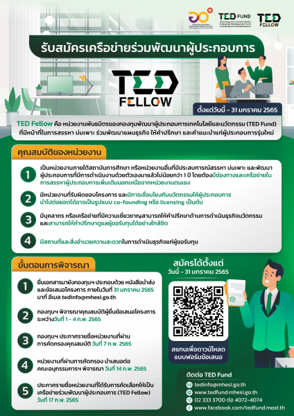 TED Fellow คือ หน่วยงานพันธมิตรของกองทุนพัฒนาผู้ประกอบการเทคโนโลยีและนวัตกรรม (TED Fund) โดย TED Fellow มีหน้าที่ในการสรรหา บ่มเพาะ ร่วมพัฒนาแผนธุรกิจ ให้คำปรึกษาและคำแนะนำแก่ผู้ประกอบการรุ่นใหม่ สำหรับเข้าร่วมโปรแกรม “การพัฒนาแนวคิดเพื่อสร้างรูปแบบธุรกิจนวัตกรรม (Ideation Incentive Program : IDEA) และ โปรแกรมการเริ่มต้นสร้างธุรกิจนวัตกรรม (Proof of Concept : POC) ภายใต้โครงการยุววิสาหกิจเริ่มต้น (TED Youth Startup) ซึ่งกองทุนฯ จะสนับสนุนทุนตั้งแต่ 100,000 - 1,500,000 บาท