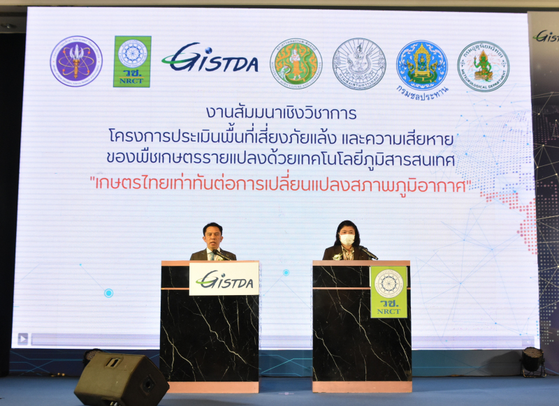 วันที่ 2 กันยายน 2565 กระทรวงการอุดมศึกษา วิทยาศาสตร์ วิจัยและนวัตกรรม (อว.) โดย สำนักงานการวิจัยแห่งชาติ (วช.) ร่วมกับ สำนักงานพัฒนาเทคโนโลยีอวกาศและภูมิสารสเทศ (องค์การมหาชน) หรือ GISTDA และภาคีเครือข่าย ได้แก่ กรมส่งเสริมการเกษตร กรมชลประทาน กรมอุตุนิยมวิทยา และสำนักปลัดกระทรวงเกษตรและสหกรณ์ จัดงานสัมมนา “การประเมินพื้นที่เสี่ยงภัยแล้งและความเสียหายของพืชเกษตรรายแปลง ด้วยเทคโนโลยีภูมิสารสนเทศ” เพื่อนำเสนอแพลตฟอร์มเทคโนโลยีภูมิสารสนเทศเพื่อสนับสนุนการตัดสินใจในการช่วยเหลือเกษตรกรผู้ประสบภัยแล้ง อีกทั้งเป็นการแลกเปลี่ยนความคิดเห็นและข้อเสนอแนะระหว่างหน่วยงานทั้งในระดับภูมิภาคและส่วนกลาง โดยมี ดร.วิภารัตน์ ดีอ่อง ผู้อำนวยการสำนักงานการวิจัยแห่งชาติ และ ดร.ปกรณ์ อาภาพันธุ์ ผู้อำนวยการ GISTDA  เป็นประธาน ณ โรงแรมอมารี ดอนเมือง แอร์พอร์ต กรุงเทพฯ