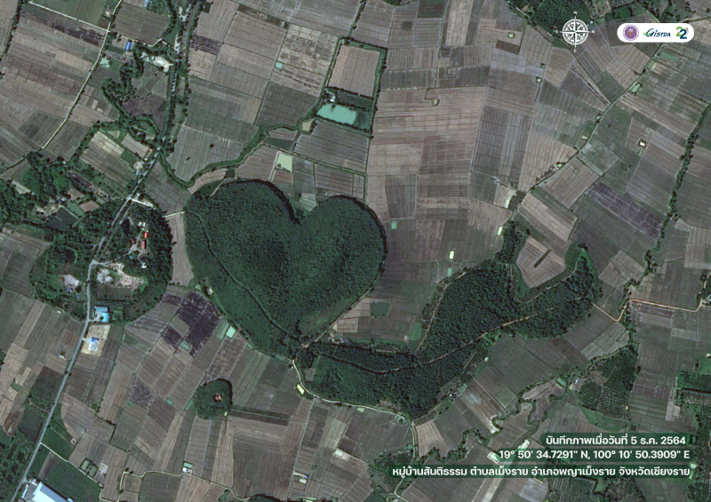 สำนักงานพัฒนาเทคโนโลยีอวกาศและภูมิสารสนเทศ (องค์การมหาชน) หรือ GISTDA ภายใต้กระทรวงการอุดมศึกษา วิทยาศาสตร์ วิจัยและนวัตกรรม (อว.) เปิดภาพถ่ายจากดาวเทียม spot-6 โชว์พื้นที่รูปหัวใจสุดโรแมนติก ซึ่งภาพที่ปรากฏเป็นพื้นที่ป่าเต็งรัง บริเวณตำบลเม็งราย อำเภอพญาเม็งราย จังหวัดเชียงราย เมื่อมองจากมุมมองอวกาศจะเห็นพื้นที่ดังกล่าวเป็นรูปหัวใจ ซึ่งอยู่ใกล้กับวัดดอยม่อนป่ายาง (วัดสันติธรรม) และสำนักสงฆ์สันติธรรม เป็นเสมือนหนึ่งหัวใจที่อยู่ใกล้ธรรมะ และธรรมชาติ