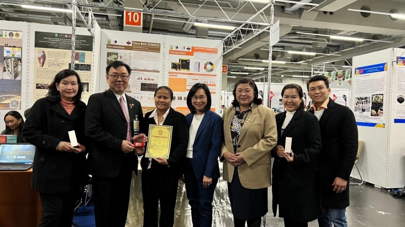 ดร.ชุติมา เอี่ยมโชติชวลิต ผู้ว่าการ สถาบันวิจัยวิทยาศาสตร์และเทคโนโลยีแห่งประเทศไทย (วว.) กระทรวงการอุดมศึกษา วิทยาศาสตร์ วิจัยและนวัตกรรม (อว.) พร้อมด้วย นางศิรินันท์ ทับทิมเทศ ผอ.ศูนย์เชี่ยวชาญนวัตกรรมอาหาร วว. ร่วมรับรางวัลผลงานนวัตกรรม Bronze medal from iENA 2023 และ Special award from Association of Polish Inventors and Rationalizers ประเทศโปแลนด์ จากผลงานผลิตภัณฑ์เสริมอาหารรูเซี่ยมพลัสเพื่อบำรุงกระดูกและข้อจากเจลาตินไฮโดรไลเสส และรางวัล Special award from Taiwan Prominent Inventor League ประเทศไต้หวัน ด้วยผลงานผลิตภัณฑ์รักษาฝ้าจากสารสกัดดอกบัวสาย ในเวทีประกวดนานาชาติ “The International Trade Fair-Ideas, Inventions and New products” หรือ iENA 2023 ในวันที่ 31 ตุลาคม 2566 ณ เมืองนูเรมเบิร์ก สหพันธ์สาธารณรัฐเยอรมนี
