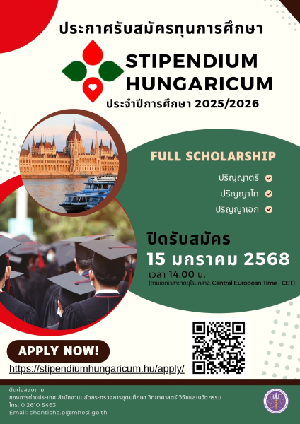 รัฐบาลฮังการีกำลังเปิดรับสมัครทุนการศึกษา Stipendium Hungaricum ประจำปีการศึกษา 2025-2026 สำหรับนักเรียนและนักศึกษาสัญชาติไทย เพื่อเดินทางไปศึกษาต่อ ณ สถาบันอุดมศึกษาในประเทศฮังการีในระดับปริญญาตรี ปริญญาโท และปริญญาเอก โดยทุนการศึกษาดังกล่าวอยู่ภายใต้บันทึกความเข้าใจว่าด้วยความร่วมมือภายใต้โครงการทุนการศึกษา Stipendium Hungaricum ระหว่างกระทรวงการอุดมศึกษา วิทยาศาสตร์ วิจัยและนวัตกรรมกับกระทรวงการต่างประเทศและการค้าฮังการี ซึ่งรัฐบาลฮังการีจะมอบทุนการศึกษาแบบเต็มจำนวนให้แก่นักเรียนและนักศึกษาไทยที่มีความสามารถโดดเด่น