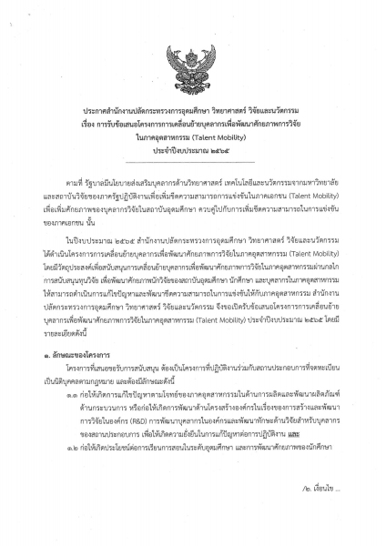 โครงการการเคลื่อนย้ายบุคลากร เพื่อพัฒนาศักยภาพการวิจัยในภาคอุตสาหกรรม (Talent Mobility) เป็นกลไกการสนับสนุนทุนวิจัย เพื่อพัฒนาศักยภาพนักวิจัยของสถาบันอุดมศึกษา นักศึกษา