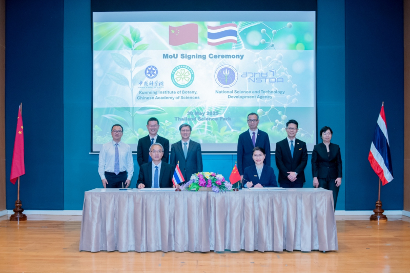 ปทุมธานี - 30 พฤษภาคม 2568 : 2 หน่วยงานวิจัยระดับประเทศของไทยและจีน ได้แก่ สำนักงานพัฒนาวิทยาศาสตร์และเทคโนโลยีแห่งชาติ (สวทช.) โดยศูนย์พันธุวิศวกรรมและเทคโนโลยีชีวภาพแห่งชาติ (BIOTEC) และ สถาบันวิจัยพฤกษศาสตร์คุนหมิง (Kunming Institute of Botany: KIB) สถาบันวิจัยด้านพฤกษศาสตร์ชั้นนำของสาธารณรัฐประชาชนจีน ภายใต้สถาบันบัณฑิตวิทยาศาสตร์จีน (Chinese Academy of Sciences: CAS) ลงนามความร่วมมือด้านการวิจัยทางการเกษตรและเทคโนโลยีชีวภาพ การผนึกกำลังครั้งนี้มีเป้าหมายเพื่อนำจุดเด่นของแต่ละหน่วยงานมาร่วมกันสร้างองค์ความรู้และงานวิจัยด้านการอนุรักษ์และใช้ประโยชน์ความหลากหลายทางชีวภาพอย่างยั่งยืนของจีนและภูมิภาคเอเชียตะวันออกเฉียงใต้ โดยมีนายหม่า มิงเกิง ที่ปรึกษาด้านวิทยาศาสตร์และเทคโนโลยี สถานเอกอัครราชทูตสาธารณรัฐประชาชนจีนประจำประเทศไทย ร่วมแสดงความยินดี พร้อมด้วยผู้บริหาร และนักวิจัยจากทั้งสองหน่วยงานร่วมในงาน