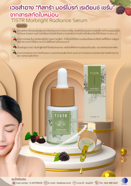 กระทรวงการอุดมศึกษา วิทยาศาสตร์ วิจัยและนวัตกรรม (อว.) โดย ศูนย์เชี่ยวชาญนวัตกรรมผลิตภัณฑ์สมุนไพร สถาบันวิจัยวิทยาศาสตร์และเทคโนโลยีแห่งประเทศไทย (วว.) ประสบผลสำเร็จในการวิจัยและพัฒนา ผลิตภัณฑ์เวชสำอาง ทิสทร้า มอร์ไบรท์ เรเดียนซ์ เซรั่ม จากสารสกัดใบหม่อน (TISTR Morbright Radlance Serum) โดยใช้สารสกัดใบหม่อนพันธุ์สกลจากจังหวัดมุกดาหาร ซึ่งผลิตภัณฑ์นี้สามารถยับยั้งการทำงานของเอนไซม์ไทโรซิเนส ซึ่งเป็นเอนไซม์ที่มีบทบาทในการสร้างเม็ดสีเมลานิน การทำงานนี้ช่วยลดการสร้างเม็ดสีและลดเลือนจุดด่างดำได้อย่างมีประสิทธิภาพ ทำให้ผิวขาวกระจ่างใสอย่างเป็นธรรมชาติ