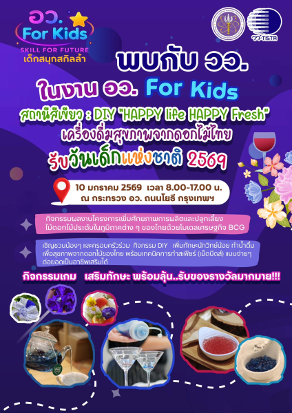 ซึ่งน้องๆ และผู้ปกครองที่เข้าร่วมกิจกรรม ในวันที่ 10 มกราคม 2569 จะได้สนุกและลงมือทำด้วยตัวเอง ในกิจกรรม DIY ที่ วว. นำ วิทยาศาสตร์ เทคโนโลยีและนวัตกรรม (วทน.) ช่วยเพิ่มทักษะให้กับนักวิทย์น้อย ด้วยการทำน้ำดื่มเพื่อสุขภาพจากดอกไม้ของไทย พร้อมเทคนิคการทำสเฟียร์ (เม็ดบีดส์) แบบง่ายๆ ที่สามารถนำไปต่อยอดเป็นอาชีพเสริมได้ นอกจากนี้ยังมีกิจกรรมเกมเสริมทักษะ พร้อมมอบของรางวัลมากมาย...วว. ขอเชิญชวนน้องๆ และผู้ปกครองเข้าร่วมกิจกรรมดังกล่าว ณ บูธ หมายเลข 15 ณ กระทรวง อว. ถนนโยธี กรุงเทพฯ