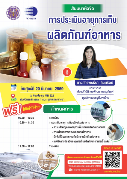 กระทรวงการอุดมศึกษา วิทยาศาสตร์ วิจัยและนวัตกรรม (อว.) โดย ศูนย์การบรรจุหีบห่อไทย สถาบันวิจัยวิทยาศาสตร์และเทคโนโลยีแห่งประเทศไทย (วว.) จัดสัมมนาฟรี! หัวข้อ “การประเมินอายุการเก็บผลิตภัณฑ์อาหาร” ในวันที่ 20 มีนาคม 2569 ณ ห้อง MR 222 ไบเทค บางนา ถ่ายทอดความรู้โดยวิทยากรผู้เชี่ยวชาญ พร้อมแลกเปลี่ยนข้อคิดเห็นเพื่อเสริมแกร่งผู้ประกอบการไทยด้วยวิทยาศาสตร์ เทคโนโลยีและนวัตกรรม