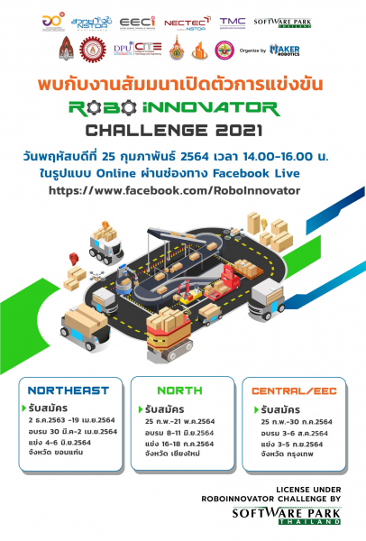 กระทรวงการอุดมศึกษา วิทยาศาสตร์ วิจัยและนวัตกรรม สำนักงานพัฒนาวิทยาศาสตร์และเทคโนโลยีแห่งชาติ (สวทช.) โดย เขตอุตสาหกรรมซอฟต์แวร์ประเทศไทย เปิดรับสมัครการแข่งขันหุ่นยนต์ไร้การบังคับอัจฉริยะ“RoboInnovator Challenge 2021 By Software Park Thailand” เพื่อพัฒนาบุคลากรให้มีความรู้ ความสามารถขั้นสูงด้านระบบอัตโนมัติ หุ่นยนต์ และระบบอัจฉริยะ ยกระดับอุตสาหกรรมไทย ไปสู่ Smart Industry และเป็นเวทีในการเฟ้นหาผู้ที่มีความสามารถพิเศษทางด้านระบบอัตโนมัติ หุ่นยนต์ และระบบอัจฉริยะ ทั้งนี้ ขอเชิญผู้สนใจร่วมสมัครได้ตั้งแต่บันนี้ จนถึง 21 พฤษภาคม 2564 และสามารถดูรายละเอียดเพิ่มเติมได้ที่ http://northeast.roboinnovator.com/register/ หรือติดต่อสอมถามที่ Email : phuwasit@p-robotics.net หรือ โทร. 0863999962