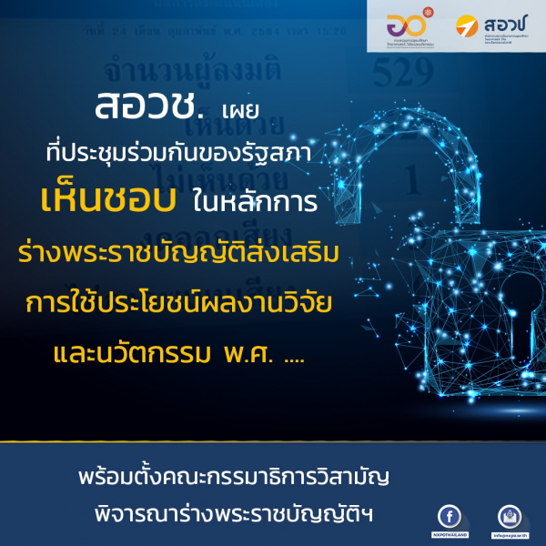 ดร. กิติพงค์ พร้อมวงค์ ผู้อำนวยการสำนักงานสภานโยบายการอุดมศึกษา วิทยาศาสตร์ วิจัยและนวัตกรรมแห่งชาติ (สอวช.) เปิดเผยว่า ที่ประชุมร่วมกันของรัฐสภา ครั้งที่ 4 (สมัยสามัญประจำปีครั้งที่สอง) เมื่อวันที่ 24 กุมภาพันธ์ 2564 คณะรัฐมนตรี โดยรัฐมนตรีว่าการกระทรวงการอุดมศึกษา วิทยาศาสตร์ วิจัยและนวัตกรรมแห่งชาติ (อว.) ศาสตราจารย์พิเศษ ดร. เอนก เหล่าธรรมทัศน์ ได้เสนอวาระเร่งด่วน ร่างพระราชบัญญัติส่งเสริมการใช้ประโยชน์ผลงานวิจัยและนวัตกรรม พ.ศ. … โดยที่ประชุมมีมติรับหลักการร่างพระราชบัญญัติฉบับดังกล่าว ด้วยคะแนน 525 เสียง ไม่เห็นด้วย 1 เสียง และงดออกเสียง 3 เสียง พร้อมเห็นชอบให้ตั้งคณะกรรมาธิการวิสามัญพิจารณาร่างพระราชบัญญัติส่งเสริมการใช้ประโยชน์ผลงานวิจัยและนวัตกรรม พ.ศ. … จำนวนทั้งสิ้น 49 คน