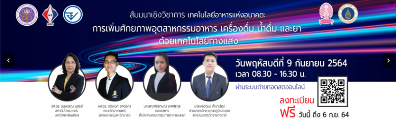 (9 กันยายน 2564) นางอัจฉรา เจริญสุข ผู้อำนวยการ มว. เป็นประธานเปิดงานสัมมนาผ่านระบบการถ่ายทอดสดหัวข้อ “เทคโนโลยีอาหารแห่งอนาคต: การเพิ่มศักยภาพอุตสาหกรรมอาหาร เครื่องดื่ม น้ำดื่มและยาด้วยเทคโนโลยีแสง” ซึ่งจัดขึ้นโดยฝ่ายมาตรวิทยาอุณหภูมิและแสง เรื่องที่บรรยายในช่วงเช้า ได้แก่ ข้อกำหนดและระเบียบวิธีการขึ้นทะเบียนตามประกาศกรทรวงสาธารณสุข (ฉบับที่ 376) พ.ศ. 2559 เรื่องอาหารใหม่ (Novel Foods) บรรยายให้ความรู้โดย นางสาวศิริลักษณ์ เกศศิริกุล จากกองอาหาร สำนักงานคณะกรรมการอาหารและยา (อย.) ต่อด้วยเรื่อง ข้อกำหนด มาตรฐาน และการตรวจวัด สำหรับเทคโนโลยีรังสียูวีในกระบวนการผลิตอาหารรูปแบบใหม่ โดย นายพลวัฒน์ จำปาเรือง นักมาตรวิทยาปฏิบัติการ กลุ่มงานแสงและสี ฝ่ายมาตรวิทยาอุณหภูมิและแสง สถาบันมาตรวิทยาแห่งชาติ (มว.) ในช่วงบ่ายก็ได้มีการบรรยายในเรื่อง ปฏิกิริยาชีวเคมีเชิงแสง (Photochemistry and Photobiology) ต่อจุลินทรีย์ สารออกฤทธิ์สำคัญ สารประกอบอินทรีย์และอนินทรีย์ในอาหาร โดย ผศ.ดร. กิติพงศ์ อัศตรกุล อาจารย์สาขาจุลชีววิทยาทางอาหาร ภาควิชาเทคโนโลยีทางอาหาร คณะวิทยาศาสตร์ จุฬาลงกรณ์มหาวิทยาลัย ต่อด้วย การประเมินผลทางวิทยาศาสตร์ของอาหารแนวใหม่ (Novel Foods) โดย รศ.ดร. ชนิพรรณ บุตรยี่ จากสถาบันโภชนาการแห่งมหาวิทยาลัยมหิดล