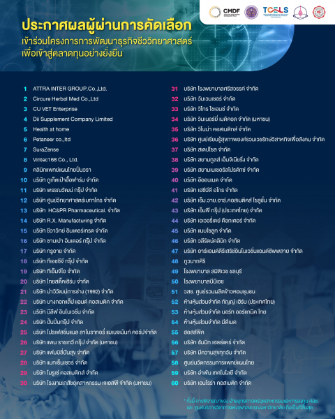 กระทรวงการอุดมศึกษาวิทยาศาสตร์ วิจัยและนวัตกรรม (อว.) โดย ศูนย์ความเป็นเลิศชีววิทยาศาสตร์ (องค์การมหาชน) หรือ ทีเซลส์ (TCELS) ร่วมกับ กองทุนส่งเสริมการพัฒนาตลาดทุน (CMDF), ศูนย์บริการวิชาการแห่งจุฬาลงกรณ์มหาวิทยาลัย และมหาวิทยาลัยศรีนครินทรวิโรฒ (มศว) ประกาศผลผู้ผ่านการคัดเลือกเข้าร่วม “โครงการการพัฒนาธุรกิจชีววิทยาศาสตร์เพื่อเข้าสู่ตลาดทุนอย่างยั่งยืน” เพื่อยกระดับและพัฒนาศักยภาพกลุ่มอุตสาหกรรมชีววิทยาศาสตร์ ด้านการแพทย์และสุขภาพ ซึ่งเป็นกลไกในการขับเคลื่อนระบบเศรษฐกิจและสังคมของประเทศ สู่การดำเนินธุรกิจอย่างยั่งยืน