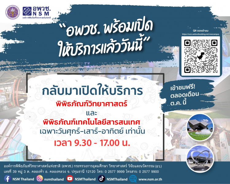 (15 ตุลาคม 2564) ปทุมธานี / องค์การพิพิธภัณฑ์วิทยาศาสตร์แห่งชาติ (อพวช.) กระทรวงการอุดมศึกษา วิทยาศาสตร์ วิจัยและนวัตกรรม (อว.) กลับมาเปิดให้บริการพิพิธภัณฑ์ตั้งแต่วันนี้เป็นต้นไป โดยระยะแรกกลับมาเปิดให้บริการ 2 พิพิธภัณฑ์ เฉพาะวันศุกร์ เสาร์ และอาทิตย์ ได้แก่ พิพิธภัณฑ์วิทยาศาสตร์ และพิพิธภัณฑ์เทคโนโลยีสารสนเทศ ณ ต.คลองห้า อ.คลองหลวง จ.ปทุมธานี สำหรับจัตุรัสวิทยาศาสตร์ อพวช. เดอะ สตรีท รัชดา กรุงเทพฯ และจัตุรัสวิทยาศาสตร์ อพวช. จ.เชียงใหม่ เปิดให้เข้าชมตามปกติ พิเศษ!ต้อนรับการกลับมา เปิดให้เข้าชมพิพิธภัณฑ์และนิทรรศการ “หนึ่งวัน บนดาวอังคาร (SOL#1 : A DAY ON MARS)” ฟรี! ตลอดเดือนตุลาคม 2564 นี้