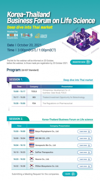 กระทรวงการอุดมศึกษา วิทยาศาสตร์ วิจัยและนวัตกรรม (อว.) โดย ศูนย์ความเป็นเลิศด้านชีววิทยาศาสตร์ (องค์การมหาชน) หรือ ทีเซลส์ (TCELS) ผนึกพลังร่วมกับหน่วยงาน Korea Health Industry Development Institute (KHIDI) ประเทศเกาหลี จัดงานสัมมนาออนไลน์ “Korea-Thailand: Startup Boot Camp” วันพุธที่ 20 ตุลาคม 64 เวลา 13.00-15.00 น. เพื่อแลกเปลี่ยน และเรียนรู้สถานะปัจจุบันด้านยาและยาชีววัตถุ โดยเชื่อมโยงให้เกิดการแลกเปลี่ยนองค์ความรู้ระหว่างสองประเทศ และกระตุ้นให้มีการจับคู่กับภาคธุรกิจ