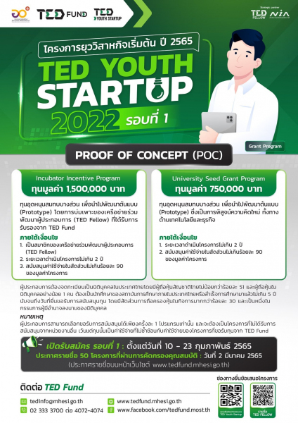 กองทุนพัฒนาผู้ประกอบการเทคโนโลยีและนวัตกรรม (TED Fund) กระทรวงการอุดมศึกษา วิทยาศาสตร์ วิจัยและนวัตกรรม ขอเชิญชวนนิสิต นักศึกษา และบัณฑิตจบใหม่ ที่มีความสนใจในการพัฒนาธุรกิจบนฐานของเทคโนโลยีและนวัตกรรม และต้องการเข้าถึงแหล่งทุนเพื่อพัฒนาไอเดียธุรกิจออกสู่เชิงพาณิชย์ สมัครเข้าร่วม “โครงการยุววิสาหกิจเริ่มต้น ประจำปี 2565 (TED Youth Startup 2022) รอบที่ 1”