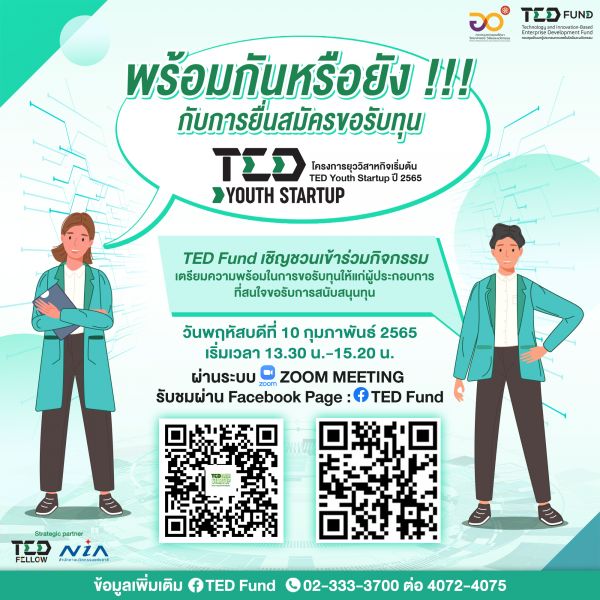 กองทุนพัฒนาผู้ประกอบการเทคโนโลยีและนวัตกรรม (TED Fund) ขอเชิญ ผู้ประกอบการที่สนใจขอรับการสนับสนุนทุนจากโครงการยุววิสาหกิจเริ่มต้น (TED Youth Startup) ปี 2565 ร่วมรับฟังการบรรยาย ระบบลงทะเบียน ขั้นตอน วิธีการและเกณฑ์การสมัครต่างๆ ของโครงการฯ ผ่านระบบ ZOOM MEETING รับชมผ่าน Facebook Page : TED Fund วันนี้พบกัน ตั้งแต่เวลา 13.30 เป็นต้นไป