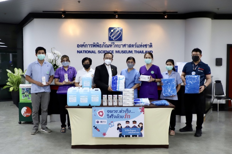 4 มีนาคม 2565 / ดร.ชนินทร วรรณวิจิตร รองผู้อำนวยการองค์การพิพิธภัณฑ์วิทยาศาสตร์แห่งชาติ และคณะเจ้าหน้าที่ อพวช. เป็นผู้แทนส่งมอบหน้ากากอนามัย แอลกอฮอล์ 75% 5,000 มล. ชุด PPE และเครื่องวัดอุณหภูมิ ให้แก่โรงพยาบาลคลองหลวง และสำนักงานสาธารณสุขอำเภอคลองหลวง เพื่อนำไปใช้สำหรับดูแลผู้ป่วย โดยมีเจ้าหน้าที่จากโรงพยาบาลคลองหลวง และสำนักงานสาธารณสุขอำเภอคลองหลวง เป็นผู้รับมอบ ณ อาคารสำนักงาน อพวช. คลองห้า จ.ปทุมธานี