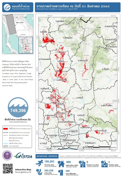 GISTDA ติดตามสถานการณ์น้ำท่วมในพื้นที่บางส่วนของลุ่มน้ำเจ้าพระยา ลุ่มน้ำป่าสัก ลุ่มน้ำบางปะกง และลุ่มน้ำมูล ด้วยดาวเทียม Radarsat-2 (เรดาร์แซท-2) เมื่อวันที่ 31 สิงหาคม 2565 พบพื้นที่น้ำท่วมขังแล้วทั้งสิ้น 749,396 ไร่ โดยเฉพาะในเขตพื้นที่บางส่วนของจังหวัด #สุโขทัย #พิษณุโลก #พิจิตร #เพชรบูรณ์ #นครสวรรค์ #ชัยนาท #สิงห์บุรี #สุพรรณบุรี #อ่างทอง #พระนครศรีอยุธยา #นครนายก #ปราจีนบุรี และ #นครราชสีมา ในขณะที่พื้นที่ปลูกข้าวโดยรวมได้รับผลกระทบแล้ว 260,558 ไร่
