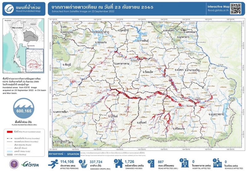 23 กันยายน 65 ข้อมูลจากดาวเทียม ICEYE พบน้ำท่วมขังในบริเวณหลายพื้นที่ของลุ่มน้ำชี และลุ่มน้ำมูล ทั้งสิ้น 600,165 ไร่ แบ่งเป็นจังหวัด #ศรีสะเกษ 124,049 ไร่ #สุรินทร์ 98,322 ไร่ #บุรีรัมย์ 84,708 ไร่ #นครราชสีมา 71,986 ไร่ #อุบลราชธานี 50,347 ไร่ #ร้อยเอ็ด 45,231 ไร่ #มหาสารคาม 39,927 ไร่ #ยโสธร 31,665 ไร่ #ขอนแก่น 24,220 ไร่ #ชัยภูมิ 16,303 ไร่ #กาฬสินธุ์ 12,869 ไร่ #อำนาจเจริญ 277 ไร่ และ #อุดรธานี 261 ไร่ ส่วนพื้นที่ปลูกข้าวได้รับผลกระทบทั้งสิ้น 337,724 ไร่