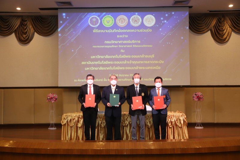 16 ธันวาคม 2565 ดร.นพ.ปฐม สวรรค์ปัญญาเลิศ อธิบดีกรมวิทยาศาสตร์บริการ (วศ.) ร่วมลงนามบันทึกข้อตกลงความร่วมมือ กับ รศ.ดร.สุวิทย์ แซ่เตีย อธิการบดีมหาวิทยาลัยเทคโนโลยีพระจอมเกล้าธนบุรี (มจธ.) ,ศ.ดร.คมสัน มาลีสี รักษาการแทนอธิการบดีสถาบันเทคโนโลยีพระจอมเกล้า เจ้าคุณทหารลาดกระบัง (สจล.) ,ศ.ดร.สมฤกษ์ จันทรอัมพร รองอธิการบดีฝ่ายวิจัยและพัฒนาเทคโนโลยีสารสนเทศมหาวิทยาลัยเทคโนโลยีพระจอมเกล้าพระนครเหนือ (มจพ.) เพื่อประสานความร่วมมือ และพัฒนาศักยภาพด้านวิทยาศาสตร์ ภายใต้กระทรวงการอุดมศึกษา วิทยาศาสตร์ วิจัยและนวัตกรรม (อว.) โดยส่งเสริมศักยภาพการวิจัยและพัฒนา โดยการใช้นวัตกรรมและเทคโนโลยีตอบสนองความต้องการของภาคอุตสาหกรรม สามารถพัฒนาขีดความสามารถของนักวิจัยในด้านต่างๆ ให้เป็นที่ยอมรับ และใช้องค์ความรู้จากงานวิจัยไทยทดแทนการนำเข้านวัตกรรมราคาแพง อันจะส่งผลดีต่อเศรษฐกิจและองค์ความรู้โดยรวมของประเทศให้ดียิ่งขึ้นไป