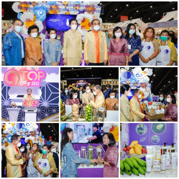 กระทรวงการอุดมศึกษา วิทยาศาสตร์ วิจัยและนวัตกรรม (อว.) โดย สถาบันวิจัยวิทยาศาสตร์และเทคโนโลยีแห่งประเทศไทย (วว.) ขนทัพผู้ประกอบการโอทอป โชว์และจำหน่ายสินค้า ผลิตภัณฑ์ ในงาน OTOP City 2022 ซึ่งกรมการพัฒนาชุมชน กระทรวงมหาดไทย จัดขึ้นระหว่างวันที่ 17 – 25 ธันวาคม 2565 ณ อาคารชาเลนเจอร์ 1-3 อิมแพ็ค เมืองทองธานี ภายใต้แนวคิด “มอบความสุขจากภูมิปัญญา ส่งต่อคุณค่าจากฝีมือคนไทย” โอกาสนี้ พลเอกประยุทธ์ จันทร์โอชา นายกรัฐมนตรี ประธานในพิธีเปิดงาน OTOP City 2022 เมื่อวันที่ 19 ธันวาคม 2565 พร้อมคณะให้เกียรติเยี่ยมชมนิทรรศการและร้านค้าผู้ประกอบการโอทอป ณ บูธนิทรรศการและร้านค้า วว. (อาคารชาเลนเจอร์ 2) ซึ่งนำวิทยาศาสตร์ เทคโนโลยีและนวัตกรรม (วทน.) เข้าไปช่วยพัฒนาศักยภาพและเสริมแกร่งผู้ประกอบการ เพื่อเพิ่มโอกาสด้านการแข่งขัน โดยมี ศ. (วิจัย) ดร.ชุติมา เอี่ยมโชติชวลิต ผู้ว่าการ วว. พร้อมด้วย นางปริยะดา วิสุทธิแพทย์ ผอ.สำนักสื่อสารองค์กร วว. นางสาวปัทมา ลิ่วเลิศมงคล ผอ.กองประชาสัมพันธ์ วว. รวมทั้งผู้ประกอบการและบุคลากร วว. ร่วมต้อนรับ