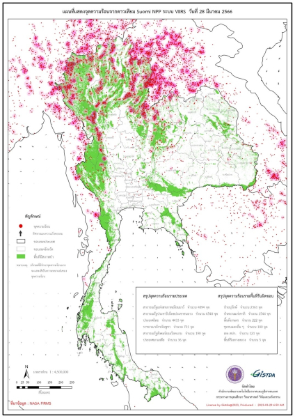 GISTDA เผยข้อมูลจากดาวเทียมซูโอมิ เอ็นพีพี (Suomi NPP) ของวันที่ 28 มีนาคม 2566 ไทยพบจุดความร้อน 4,433 จุด  โดยมีเพื่อนบ้านอย่างพม่าขึ้นนำอยู่ที่ 4,894 จุด, สปป.ลาว 4,548 บาท, กัมพูชา 701 จุด, เวียดนาม 190 จุด และ มาเลเซีย 36 จุด