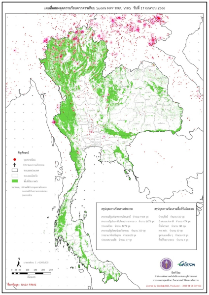 GISTDA เผยข้อมูลจากดาวเทียมซูโอมิ เอ็นพีพี (Suomi NPP) ของวันที่ 17 เมษายน 2566 ไทยพบจุดความร้อน 1,274 จุด ในขณะที่เพื่อนบ้านอย่างพม่ายังครองแชมป์อันดับหนึ่งอยู่ที่ 4,489 จุด, สปป.ลาว 1,673 จุด, เวียดนาม 319 จุด, กัมพูชา 28 จุด, และมาเลเซีย 17 จุด