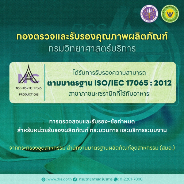 กระทรวงการอุดมศึกษา วิทยาศาสตร์ วิจัยและนวัตกรรม (อว.) กรมวิทยาศาสตร์บริการ (วศ.) โดย กองตรวจและรับรองคุณภาพผลิตภัณฑ์ (รผ.) ได้รับการรับรองความสามารถตามมาตรฐาน ISO/IEC 17065:2012 การตรวจสอบและรับรอง-ข้อกำหนดสำหรับหน่วยรับรองผลิตภัณฑ์ กระบวนการ และบริการระบบงาน จากกระทรวงอุตสาหกรรม สำนักงานมาตรฐานผลิตภัณฑ์อุตสาหกรรม (สมอ.) สาขาภาชนะที่ใช้กับอาหาร เพื่อ สร้างความเชื่อมั่นในการดำเนินงาน ยกระดับผู้ประกอบการของไทยให้ได้มาตรฐานอย่างต่อเนื่อง ตลอดจนเพิ่มศักยภาพการแข่งขันของประเทศอย่างเป็นรูปธรรม