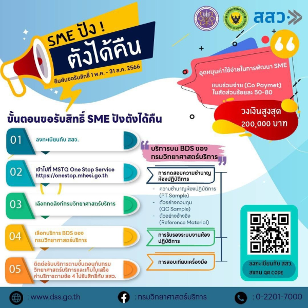 ภายในงานดังกล่าว ดร.จริยาวดี ศิริจันทรา ผู้แทน วศ.อว. ได้ร่วมแลกเปลี่ยนในเวทีเสวนาพร้อมกับ 46 พันธมิตร ทั้งนี้ วศ.อว.ได้ร่วมมือกับ สสว. ในการช่วยเหลือผู้ประกอบการ SME ผ่านช่องทาง BDS ภายใต้โครงการ “SME ปัง!! ตังได้คืน” เป็นการอุดหนุนค่าใช้จ่ายในการพัฒนา SME แบบร่วมจ่าย (Co Payment) ในสัดส่วนร้อยละ 50-80 วงเงินสูงสุด 200,000 บาท สำหรับบริการของ วศ.บนช่องทาง BDS ประกอบด้วย การทดสอบความชำนาญห้องปฏิบัติการ การรับรองระบบงานห้องปฏิบัติการ และการสอบเทียบเครื่องมือ โดยมีขั้นตอนการรับสิทธิ์ “SME ปัง!! ตังได้คืน” 5 ขั้นตอน ได้แก่ (1) ลงทะเบียนกับ สสว. (2) เข้าไปที่ MSTQ One Stop Service http://onestop.mhesi.go.th (3) เลือกกดลิ้งค์กรมวิทยาศาสตร์บริการ (4) เลือกบริการ BDS ของกรมวิทยาศาสตร์บริการ (5) ติดต่อรับบริการตามขั้นตอนของ วศ. และเก็บใบเสร็จค่าบริการไปรับสิทธิ์กับ สสว. ต่อไป ซึ่งจะหมดเขตการรับสิทธิ์ฯ ภายในวันที่ 31 สิงหารม 2566 ผู้สนใจสามารถเข้าไปดูรายละเอียดได้ที่เว็บไซต์กรมวิทยาศาสตร์บริการ