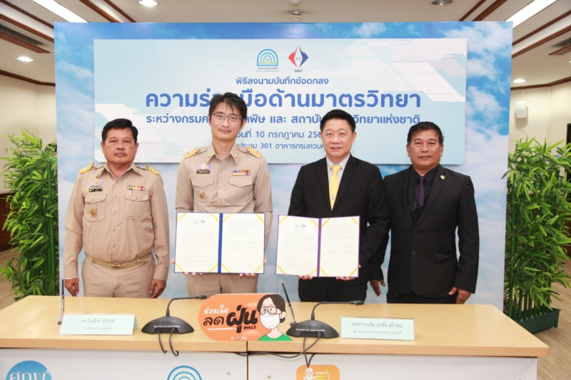 10 กรกฎาคม 66: พล.ต.ท. พรชัย สุธีรคุณ ผู้อำนวยการสถาบันมาตรวิทยาแห่งชาติ (มว.) กระทรวงการอุดมศึกษา วิทยาศาสตร์ วิจัยและนวัตกรรม (อว.) และนายปิ่นสักก์ สุรัสวดี อธิบดีกรมควบคุมมลพิษ (คพ.) กระทรวงทรัพยากรธรรมชาติและสิ่งแวดล้อม (ทส.) ร่วมลงนามบันทึกข้อตกลงว่าด้วยความร่วมมือด้านมาตรวิทยา เพื่อสร้างมาตรฐานการวัดที่ก่อให้เกิดประโยชน์กับหน่วยงานที่ปฏิบัติงานในการจัดการปัญหาสิ่งแวดล้อมต่างๆ จากการนำองค์ความรู้หรือแนวทางปฏิบัติในการตรวจวัดคุณภาพสิ่งแวดล้อม การตรวจวัดการระบายมลพิษจากแหล่งกำเนิด นำไปสู่การกำหนดแนวทางปฏิบัติเดียวกันทั่วประเทศ รวมทั้งการนำนวัตกรรมที่เกิดขึ้นจากความร่วมมือครั้งนี้ไปใช้ในการเสริมสร้างความเชื่อมั่นของระบบการวัดที่เป็นมาตรฐานของประเทศและเทียบเท่าสากล ทั้งสองหน่วยงานได้ตระหนักถึงความสำคัญและเห็นชอบร่วมกันในการพัฒนาด้านมาตรวิทยาอย่างต่อเนื่อง โดยความร่วมมือที่จะดำเนินการร่วมกันในช่วง 3 ปี นับตั้งแต่วันนี้ ถึงวันที่ 30 กันยายน 2569 ที่ครอบคลุมประเภทของมลพิษ 4 ด้าน ได้แก่ ด้านการตรวจวัดคุณภาพอากาศ ด้านการตรวจวัดการระบายมลพิษทางอากาศจากแหล่งกำเนิด ด้านการตรวจวัดคุณภาพน้ำ และด้านการตรวจวัดระดับเสียง ณ กรมควบคุมมลพิษ กรุงเทพฯ