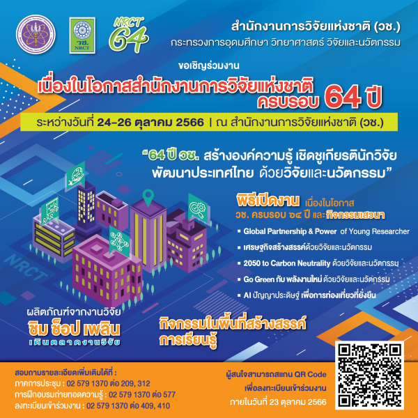 กระทรวงการอุดมศึกษา วิทยาศาสตร์ วิจัยและนวัตกรรม ขอเชิญเข้าร่วมงานเนื่องในโอกาสสำนักงานการวิจัยแห่งชาติครบรอบ 64 ปี ระหว่างวันที่ 24-26 ตุลาคม 2566
