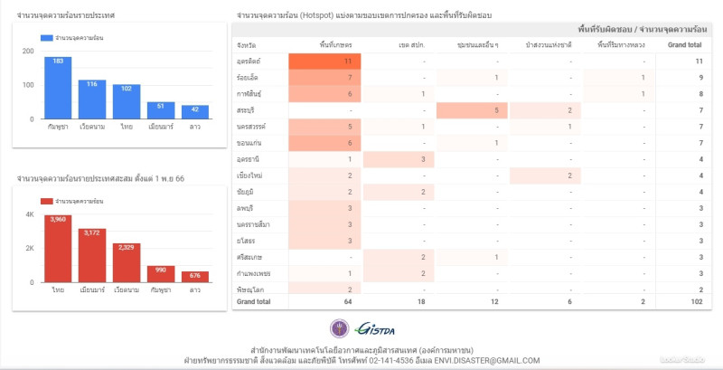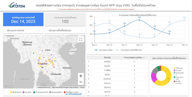 ทั้งนี้ จากข้อมูลจุดความร้อนที่รายงานโดย GISTDA เมื่อวันที่ 14 ธันวาคม 2566 พบจุดความร้อนทั้งประเทศ 102 จุด ส่วนใหญ่พบในพื้นที่การเกษตร 64 จุด ตามด้วยพื้นที่สปก. 18 จุด ชุมชนและอื่นๆ 12 จุด ป่าสงวนแห่งชาติ 6 จุด และพื้นที่ริมทางหลวง 2 จุด จังหวัดที่พบจำนวนจุดความร้อนสูงสุด 3 อันดับแรก คือ #อุตรดิตถ์ 1 จุด ตามด้วย #ร้อยเอ็ด 9 จุด และ #กาฬสินธุ์ 8 จุด