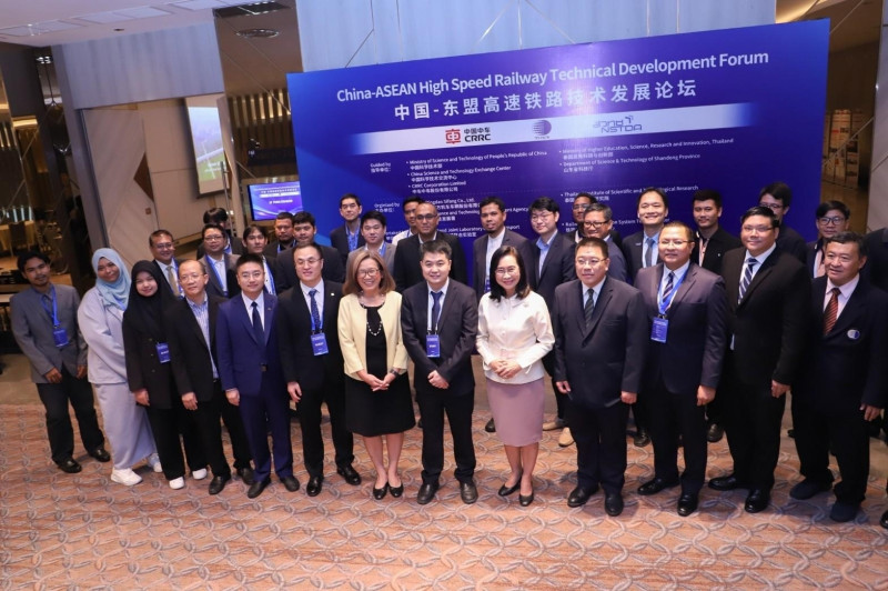 ดร.ชุติมา เอี่ยมโชติชวลิต ผู้ว่าการ สถาบันวิจัยวิทยาศาสตร์และเทคโนโลยีแห่งประเทศไทย (วว.) กระทรวงการอุดมศึกษา วิทยาศาสตร์ วิจัยและนวัตกรรม (อว.) เป็นประธานเปิดการประชุม China-ASEAN High Speed Railway Technical Development Forum ซึ่ง วว. โดย ศูนย์ทดสอบมาตรฐานระบบขนส่งทางราง (ศทร.) ร่วมกับ สำนักงานพัฒนาวิทยาศาสตร์และเทคโนโลยีแห่งชาติ (สวทช.) และ CRRC Qingdao Sifang Co.,Ltd. สาธารณรัฐประชาชนจีน จัดขึ้นระหว่างวันที่ 21-22 ธันวาคม 2566 ณ โรงแรมอัศวิน แกรนด์ คอนเวนชั่น เพื่อแลกเปลี่ยนองค์ความรู้และความร่วมมือด้านงานวิจัยระบบรางกับหน่วยงานระบบรางในกลุ่มประเทศอาเซียน ภายใต้ความร่วมมือ China-Thailand Belt and Road Joint Laboratory on Rail Transit โอกาสนี้ Mr.Yang Tingzhi, Deputy Director of Science Technology Planning Department, CRRC Sifang ดร.จิตรา ชัยวิมล รองผู้ว่าการบริการอุตสาหกรรม นายวิรัช จันทรา ที่ปรึกษาด้านบริหารคุณภาพและบริการอุตสาหกรรม ดร.อาณัติ หาทรัพย์ ผอ.ศทร. แขกผู้มีเกียรติ ผู้บริหาร บุคลากร วว. เข้าร่วมการประชุม ในวันที่ 21 ธันวาคม 2566