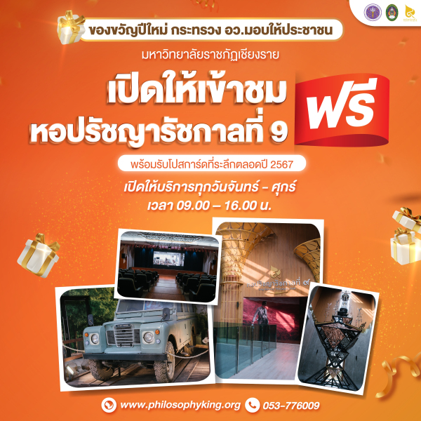 ? กระทรวงการอุดมศึกษาฯ ร่วมกับ หอปรัชญารัชกาลที่ ๙ มหาวิทยาลัยราชภัฏเชียงราย จัดโครงการของขวัญปีใหม่ให้ประชาชน โดยเปิดให้เข้าชมหอปรัชญารัชกาลที่ 9 ฟรี พร้อมรับโปสการ์ดที่ระลึก ตลอดปี 2567