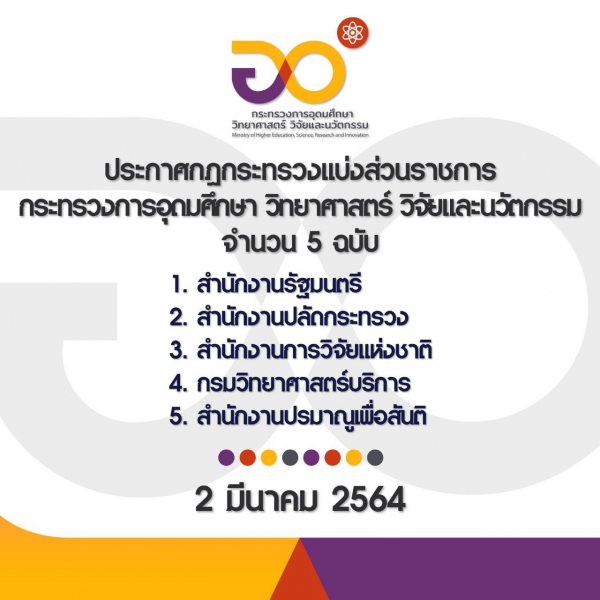 ศาสตราจารย์พิเศษ ดร.เอนก เหล่าธรรมทัศน์ รัฐมนตรีว่าการกระทรวงการอุดมศึกษา วิทยาศาสตร์ วิจัยและนวัตกรรม เปิดเผยว่า อาศัยอำนาจตามความในมาตรา 6 วรรคหนึ่ง และมาตรา 9 แห่งพระราชบัญญัติระเบียบบริหารราชการกระทรวงการอุดมศึกษา วิทยาศาสตร์ วิจัยและนวัตกรรม พ.ศ. 2562 รมว.อว. ได้ลงนามกฎกระทรวงไว้ 5 ฉบับตามที่คณะรัฐมนตรีเห็นชอบ ซึ่งได้ประกาศในราชกิจจานุเบกษา เล่มที่ 138 ตอนที่ 15 ก ลงวันที่ 2 มีนาคม พ.ศ.2564 แล้ว ได้แก่ กฎกระทรวงแบ่งส่วนราชการสำนักงานรัฐมนตรี สำนักงานปลัดกระทรวงการอุดมศึกษา วิทยาศาสตร์ วิจัยและนวัตกรรม กรมวิทยาศาสตร์บริการ สำนักงานปรมาณูเพื่อสันติ และสำนักงานการวิจัยแห่งชาติ มีผลบังคับใช้ในวันที่ 2 มีนาคม พ.ศ.2564 ซึ่งทำให้การแบ่งส่วนราชการเสร็จสมบูรณ์ โดยอำนาจหน้าที่ตามโครงสร้างใหม่ คือ