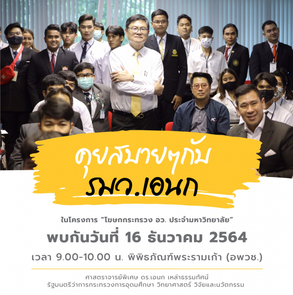 16 ธันวาคม 2564 : ศ.(พิเศษ) ดร.เอนก เหล่าธรรมทัศน์ รัฐมนตรีว่าการกระทรวงการอุดมศึกษา วิทยาศาสตร์ วิจัยและนวัตกรรม (อว.) ร่วมวงพูดคุยกับนักศึกษาที่เข้าร่วมโครงการ "โฆษกกระทรวง อว. ประจำมหาวิทยาลัย รุ่นที่ 1" ภายใต้กิจกรรม U2T Growth Mindset โครงการมหาวิทยาลัยสู่ตำบลสร้างรากแก้วให้ประเทศ พร้อมด้วย รศ.(พิเศษ) ดร.ดวงฤทธิ์ เบ็ญจาธิกุล ชัยรุ่งเรือง เลขานุการรัฐมนตรีและโฆษกกระทรวงการอุดมศึกษา วิทยาศาสตร์ วิจัยและนวัตกรรม ดร.พัชรินรุจา จันทโรนานนท์ ที่ปรึกษารัฐมนตรี เข้าร่วมในงาน โดยกิจกรรม "โฆษกกระทรวง อว. ประจำมหาวิทยาลัย รุ่นที่ 1" จัดขึ้นในระหว่างวันที่ 13-17 ธันวาคม 2564 ณ พิพิธภัณฑ์วิทยาศาสตร์แห่งชาติ คลองห้า อำเถอคลองหลวง จังหวัดประทุมธานี ตลอดระยะเวลา 5 วัน น้องๆ จะได้รวมพลังสร้างเครือข่ายนักศึกษาเพื่อการพัฒนาที่ยั่งยืน ให้ตระหนักถึงบทบาทของรัฐบาลในการยกระดับเศรษฐกิจและสังคมแบบบูรณาการ ตลอดจนเพิ่มศักยภาพในการสื่อสารในยุคดิจิทัล ซิ่งกิจกรรมนี้จะจัดเป็น 2 รุ่น โดยรุ่นที่ 2 จะจัดในวันที่ 20-24 ธันวาคม 2564