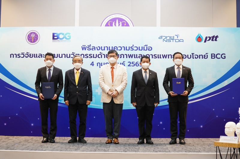 (4 กุมภาพันธ์ 2565) ณ ห้องแถลงข่าว ชั้น 1 อาคารพระจอมเกล้า สำนักงานปลัดกระทรวง อว. : กระทรวงการอุดมศึกษา วิทยาศาสตร์ วิจัยและนวัตกรรม (อว.) โดย ดร.ณรงค์ ศิริเลิศวรกุล ผู้อำนวยการสำนักงานพัฒนาวิทยาศาสตร์และเทคโนโลยีแห่งชาติ (สวทช.) พร้อมด้วย นายนพดล ปิ่นสุภา ประธานเจ้าหน้าที่ปฏิบัติการกลุ่มธุรกิจใหม่และโครงสร้างพื้นฐาน บริษัท ปตท. จำกัด (มหาชน) (ปตท.) และ ศาสตราจารย์ ดร.ไพรัช ธัชยพงษ์ อดีตปลัดกระทรวงวิทยาศาสตร์และเทคโนโลยี ในฐานะประธาน BCG สาขาเครื่องมือแพทย์ ร่วมแถลงข่าวพิธีลงนามความร่วมมือการวิจัยและพัฒนานวัตกรรมด้านสุขภาพและการแพทย์ตอบโจทย์โมเดลเศรษฐกิจ BCG ประกอบด้วย การลงนามสัญญาถ่ายทอดเทคโนโลยี น้ำยาเคลือบวัสดุคอมพอสิทของ ไฮดรอกซีอะพาไทต์และไทเทเนียมไดออกไซค์บนแผ่นนอนวูฟเวนเพื่อใช้เป็นแผ่นกรองสำหรับการผลิตหน้ากากอนามัย Safie Plus และ การลงนามความร่วมมือการวิจัยและพัฒนาวัสดุฝังในทางการแพทย์ (Implant devices) โดยได้รับเกียรติจาก ศาสตราจารย์ (พิเศษ) ดร.เอนก เหล่าธรรมทัศน์ รัฐมนตรีว่าการกระทรวงการอุดมศึกษา วิทยาศาสตร์ วิจัยและนวัตกรรม (อว.) เป็นประธานการลงนามและร่วมแสดงความยินดี พร้อมด้วย ศ.นพ.สิริฤกษ์ ทรงศิวิไล ปลัดกระทรวง อว. และผู้บริหารนักวิจัยของ 2 หน่วยงานเข้าร่วมงานแถลงข่าว