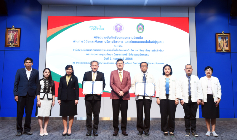 (เมื่อวันที่ 1 กุมภาพันธ์ 2566) ที่ห้องแถลงข่าว ชั้น 1 กระทรวงการอุดมศึกษา วิทยาศาสตร์ วิจัยและนวัตกรรม : สำนักงานพัฒนาวิทยาศาสตร์และเทคโนโลยีแห่งชาติ (สวทช.) และมหาวิทยาลัยราชภัฏลำปาง ลงนามในบันทึกข้อตกลงความร่วมมือด้านการวิจัยและพัฒนา การบริการวิชาการการจัดการความรู้ และการถ่ายทอดเทคโนโลยีสู่ชุมชน มุ่งเน้น 3 ด้านคือ การเกษตร การบริหารจัดการน้ำ และการพัฒนากำลังคน นำร่องด้วยฐานข้อมูลด้านคุณภาพน้ำประปาที่มีการปนเปื้อนฟลูออไรด์ โลหะหนัก และสารเคมีตกค้างด้วยนาโนเทคโนโลยี ในโรงเรียนพื้นที่ลำปางกว่า 100 แห่ง เพื่อสร้างนวัตกรคุณภาพน้ำ 100 คน รวมถึงนวัตกรรมตรวจวัดและพัฒนาคุณภาพน้ำในพื้นที่จังหวัดลำปางกว่า 270 ครัวเรือน ด้วยเป้าหมาย 2 ลด 3 เพิ่ม คือ ลดโรค ลดค่าใช้จ่าย เพิ่มการเข้าถึงน้ำสะอาด เพิ่มคุณภาพน้ำและคุณภาพชีวิต